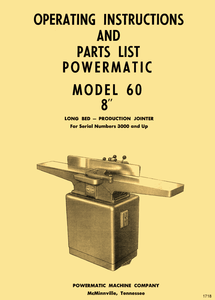 This is a reproduction, not a photocopy, of an original Powermatic Model 60 8-inch Jointer Instruction and Parts Manual starting with serial numbers 3000. This is the oldest version of the Powermatic 60 jointer that I’ve seen. This version of the Model 60 has circular hand wheels to adjust the table heights underneath each table as shown on the cover.