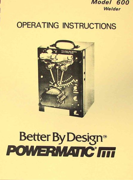 This is a reproduction, not a photocopy, of an original Powermatic 600 Blade Welder Instructions and Parts Manual. This manual contains information on operation, welding, gap adjustment procedures, trouble shooting, maintenance, wiring diagram, and a complete set of exploded view diagrams of the parts.