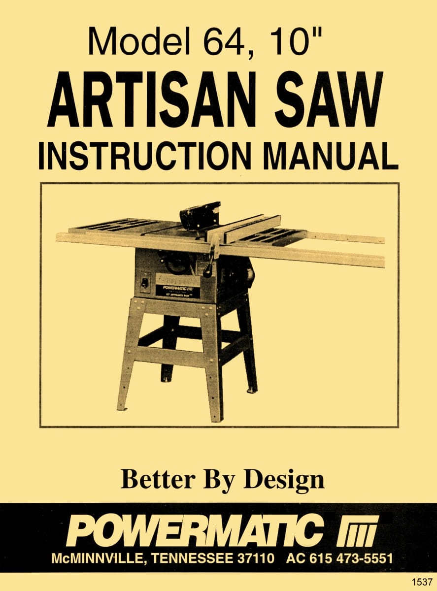 This is a reproduction, not a photocopy, of an original Powermatic Model 64 Artisan’s 10 inch Table Saw Instructions and Parts Manual. This manual contains information on set up, lubrication, adjustments, maintenance, and controls as well as a complete set of clear exploded view diagrams of all the parts with parts lists and descriptions for this Powermatic 10″ model 64 saw.