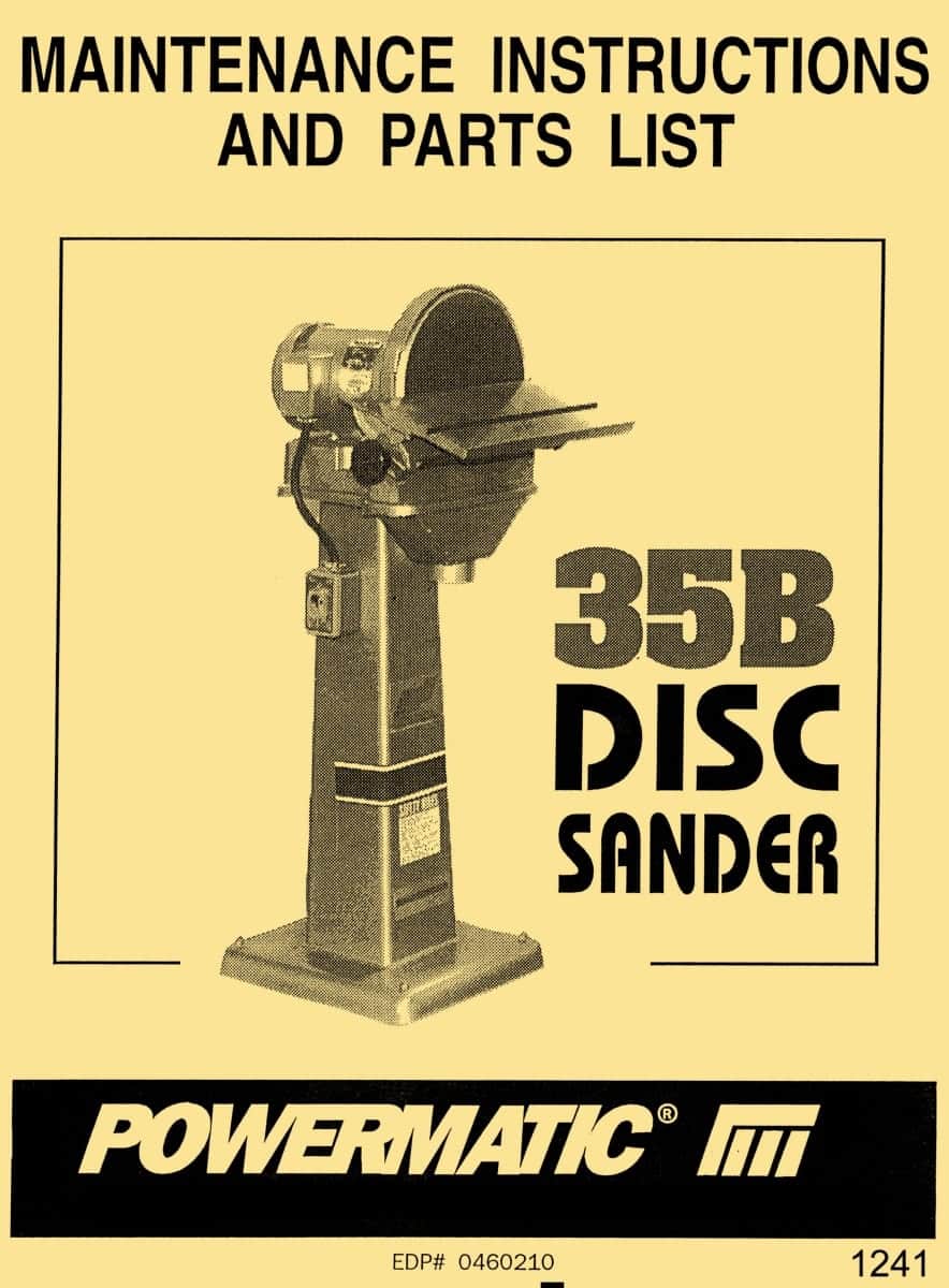 This is a reproduction, not a photocopy, of an original Powermatic Model 35B Disc Sander Instruction and Parts Manual. This manual contains information on set up, maintenance, controls, and a trouble shooting guide. The manual includes a complete parts list and exploded view parts diagrams for this Powermatic disc sander.