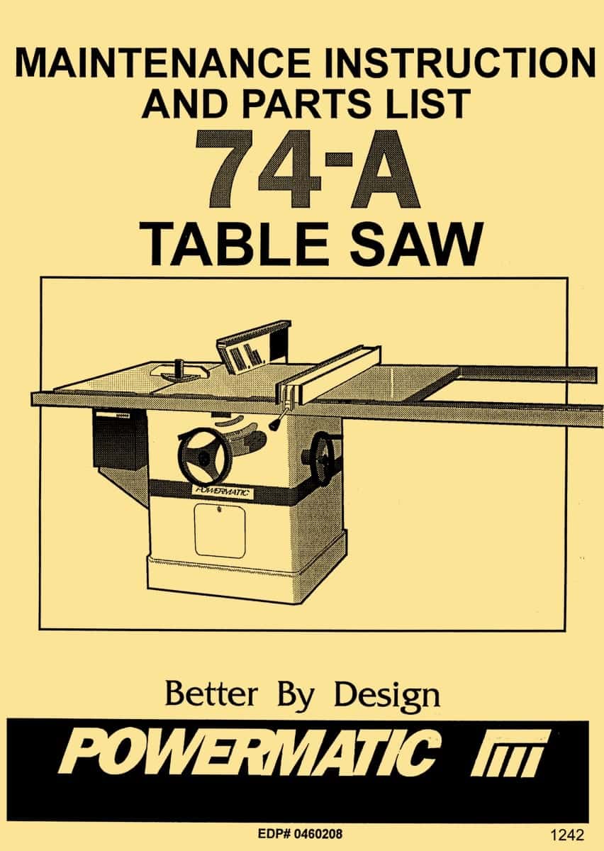 This is a reproduction, not a photocopy, of an original Powermatic Model 74-A 12″-14″ Table Saw Instruction and Parts Manual. This manual contains information on set up, blade alignment and adjustments, wiring diagram, maintenance, controls, and a trouble shooting guide. The manual includes a complete parts list and exploded view parts diagrams for this Powermatic table saw.