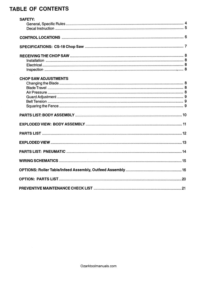 This is a reproduction, not a photocopy, of an original Powermatic Model CS-18 Up Cut Shop Saw Instruction and Parts Manual. These are similar to the ones sold as Northtech CS18. This manual contains information on set up, safety instructions, blade replacement, setting up a roller table, wiring diagram, and a pneumatic diagram. The manual includes a complete parts list and exploded view parts diagrams for this Powermatic chop saw.