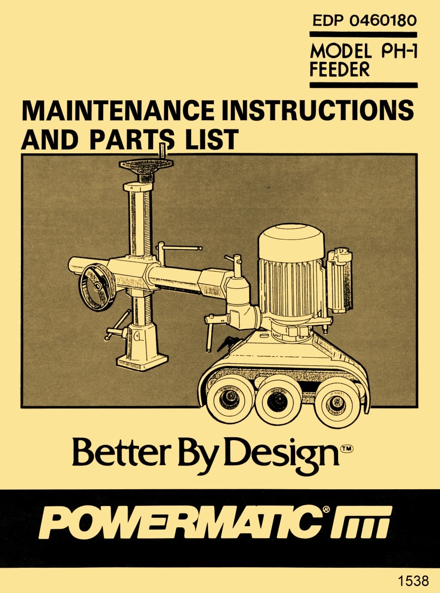 This is a reproduction, not a photocopy, of an original Powermatic PH-1 Power Feeder Instructions and Parts Manual. This manual contains information on safety, installation, operating controls, lubrication, and exploded view parts diagrams of all the parts.
