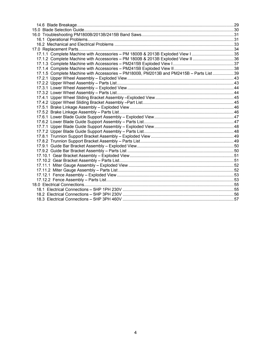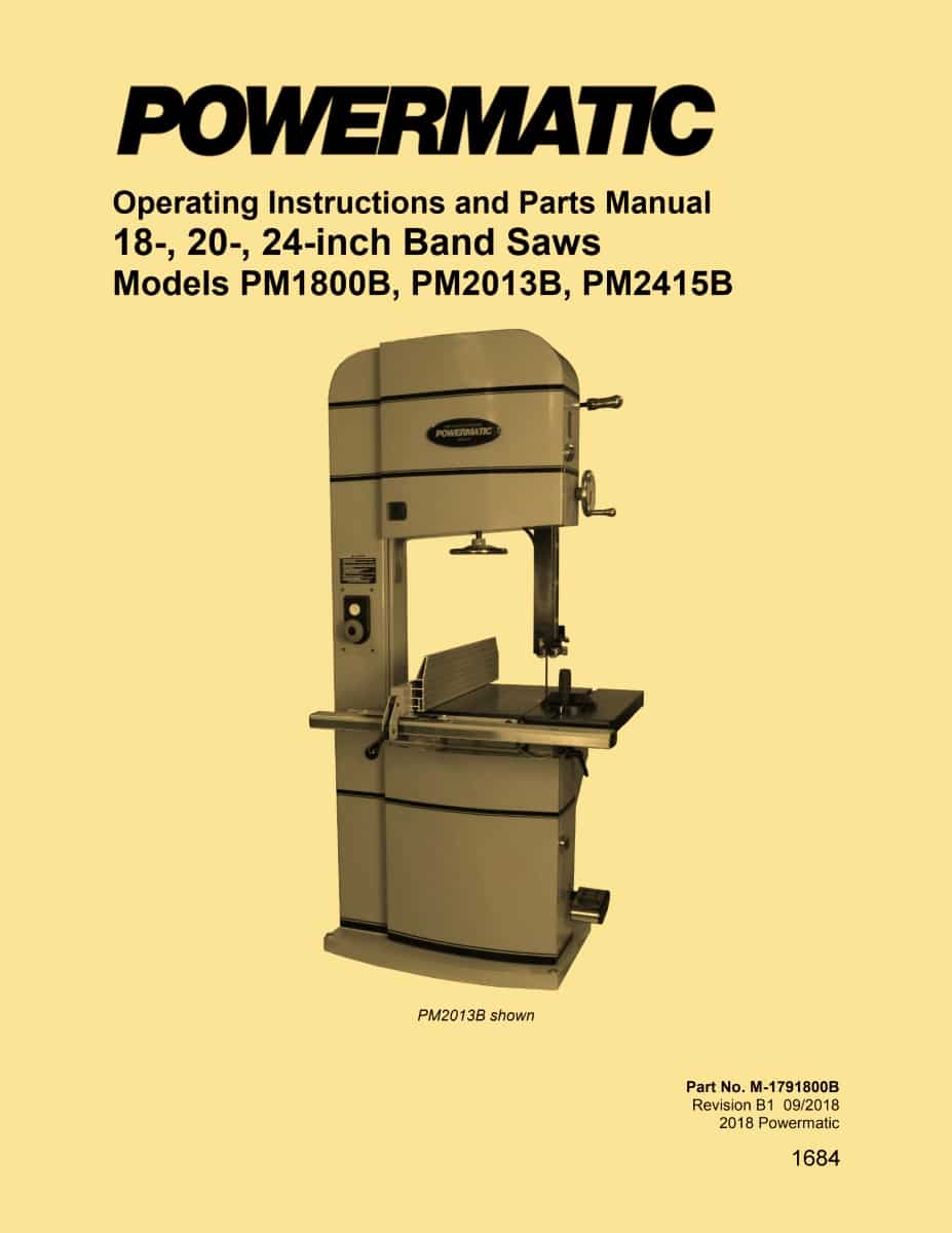 This is a reproduction, not a photocopy, of an original Powermatic 18″, 20″, and 24″ Wood Band Saws Operating Instructions and Parts List Manual for models PM1800B, PM2013B, and PM2415B. This manual contains specifications for the bandsaw, installation instructions, proper operating instructions, and various instructions for making adjustments to the fence and blade tension. The manual has a complete set of clear explosive view diagrams of all the parts with parts list and descriptions for these Powermatic band saws.