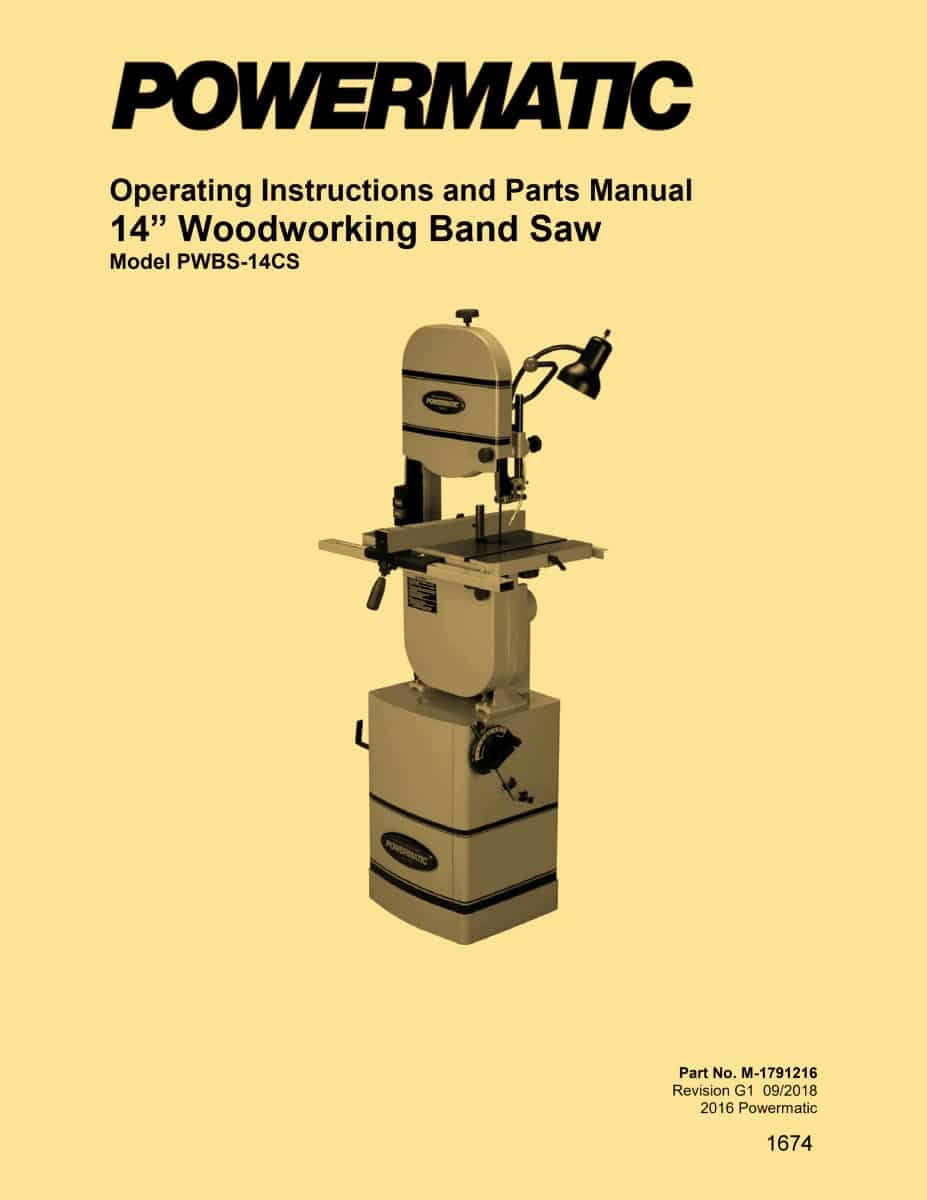 This is a reproduction, not a photocopy, of an original Powermatic 14″ Band Saw, Model PWBS-14CS, Operating Instructions and Parts List Manual. This manual contains specifications for the bandsaw, installation instructions, proper operating instructions, and various instructions for making adjustments to the fence and blade tension. The manual has a complete set of clear explosive view diagrams of all the parts with parts list and descriptions for this Powermatic 14″ band saw.