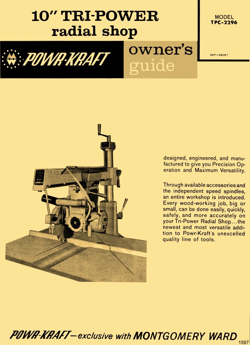 This is a reproduction of an original Powr Kraft 10″ Radial Arm Saw Operator’s and Parts Manual model TPC-2296. This manual covers the proper operating procedures, adjustments, maintenance, and a complete set of exploded view parts diagrams.