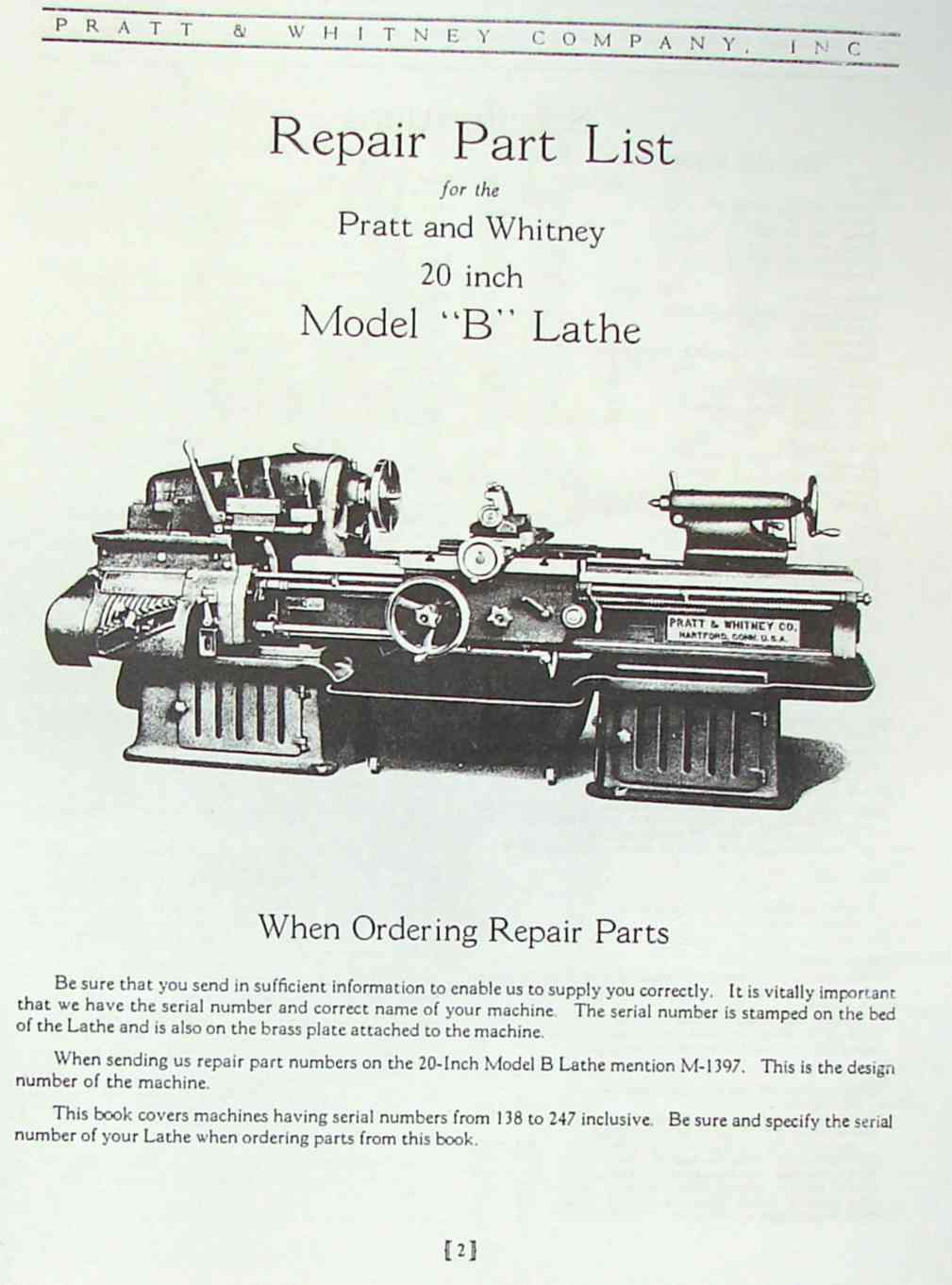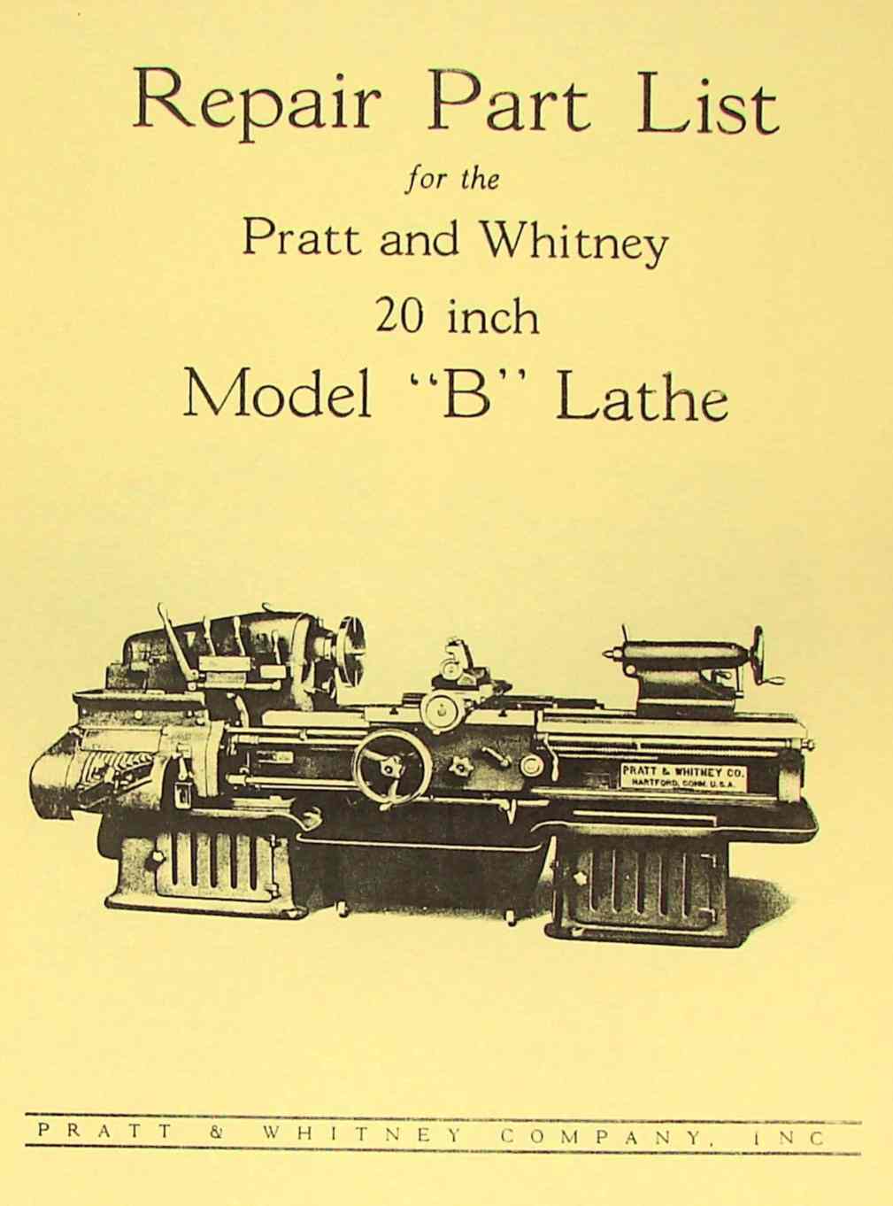 This is a reproduction, not a photocopy, of an original Pratt & Whitney 20-inch Model B Lathe Parts Manual. This is a very well diagramed parts manual.