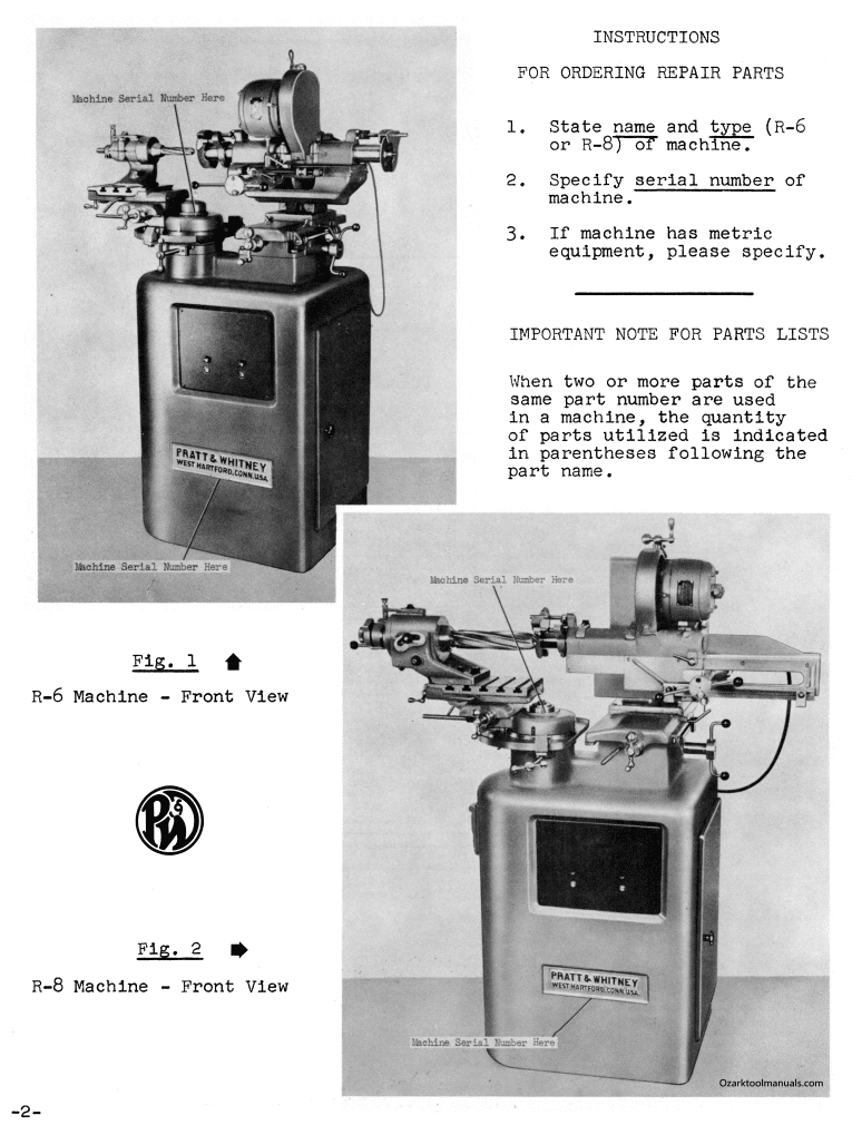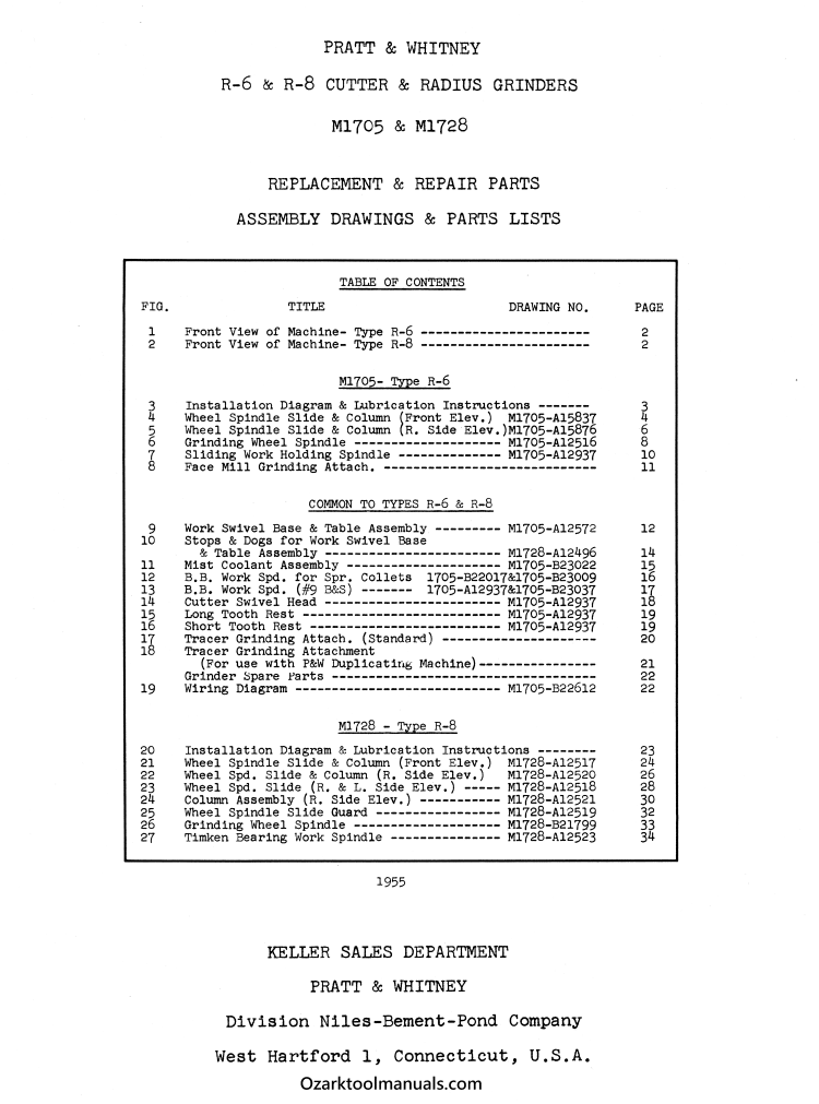 This is a reproduction, not a photocopy, of an original Pratt & Whitney R-6 and R-8 Tool Cutter and Radius Grinders M1705 and M1728 Parts Manual. This Pratt & Whitney manual contains the installation dimensions, and lubrication instructions for these grinders. The manual cross-sectional view diagrams of parts with parts list for the machines, including attachments. There is also a wiring diagram included for these Pratt & Whitney R-6 and R-8 Tool Cutter and Radius Grinders.