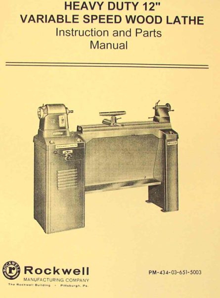 This is a reproduction, not a photocopy, of an original Rockwell Heavy Duty 12″ Variable Speed Wood Lathe Instruction and Parts Manual for the 46-612 and 46-613. This manual contains information on adjustments, maintenance, and controls as well as a complete parts list with exploded view diagrams.