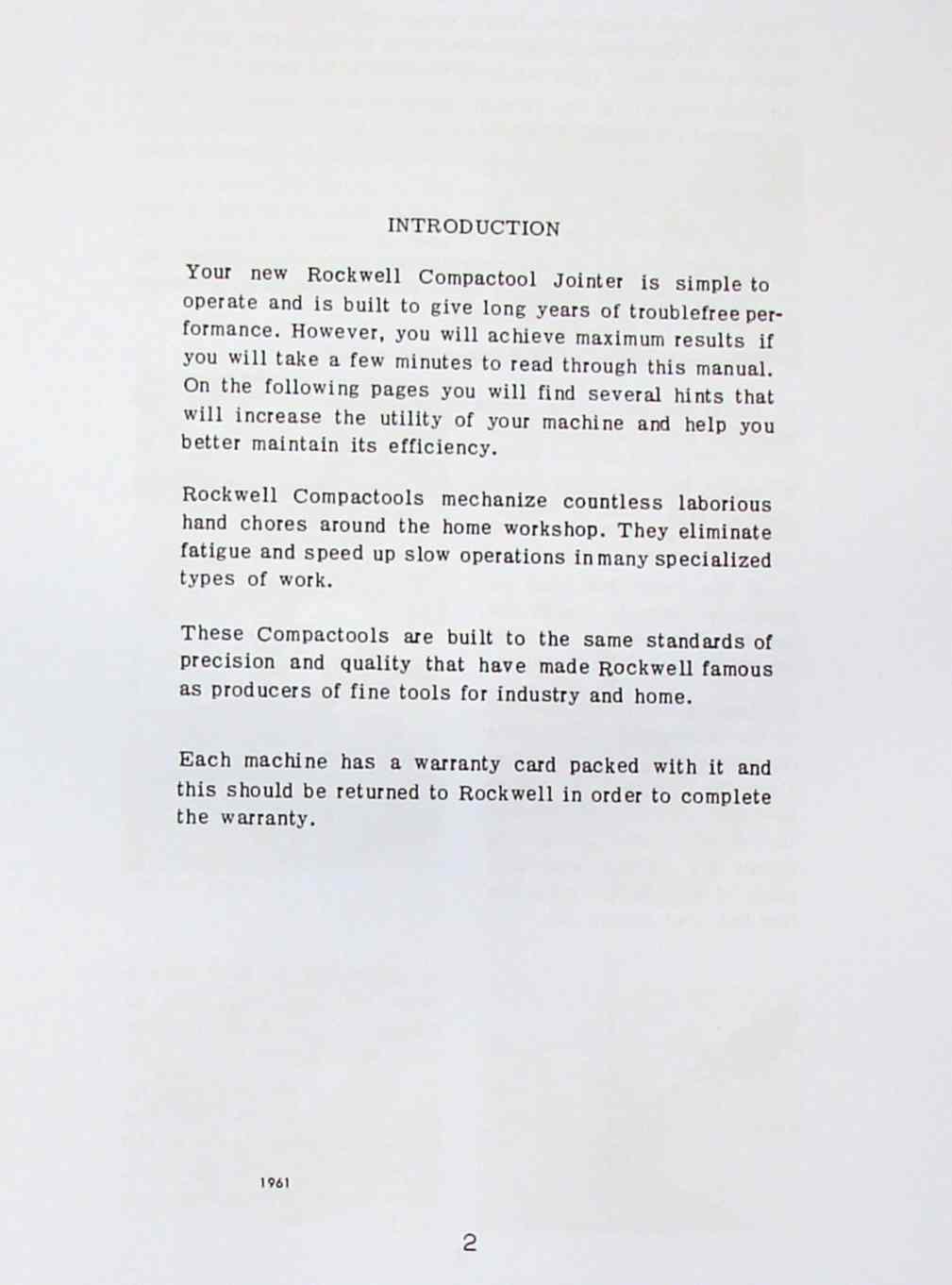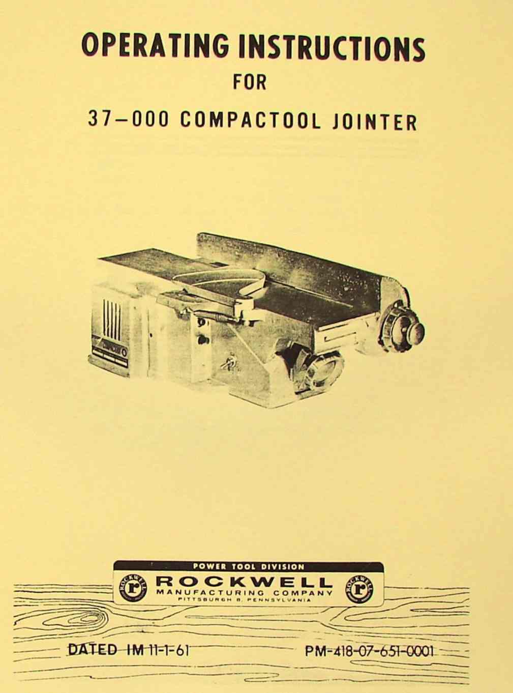 This is a reproduction, not a photocopy, of an original Rockwell 37-000 Compactool Jointer Instructions and Parts Manual. This manual contains information on operation instructions, maintenance, honing the blades, set up, and a exploded view parts diagram with descriptions.