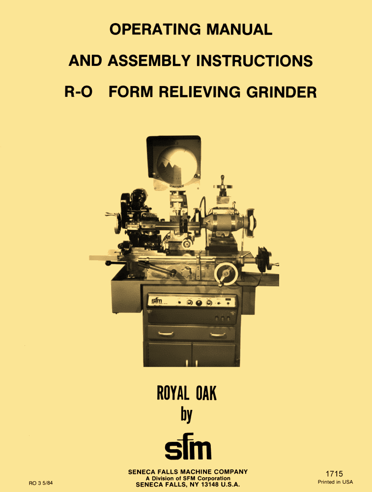 This is a reproduction, not a photocopy, of an original Royal Oak Tool R-O Form Relieving Grinder by Seneca Falls Operator and Instructions Manual. This R‑O Form Relieving Grinder Operating and Assembly Manual (Royal Oak by Seneca Falls, RO 3 5/84) is a factory‑level, practical guide and parts reference for the R‑O form relieving grinder.