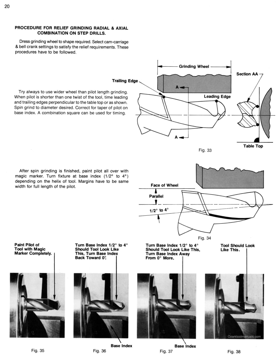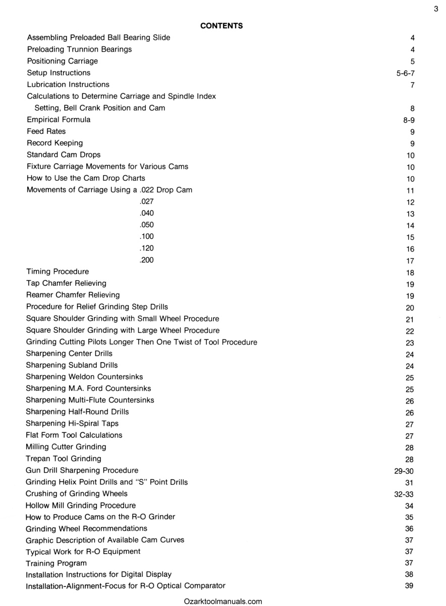 The manual provides extensive, illustrated procedures for relief grinding and sharpening across a wide range of tools — taps, reamers, step drills, square shoulders, pilots, center drills, countersinks, multi‑flute cutters, trepans, gun drills, helix and “S” point drills — and covers milling cutter and hollow mill grinding. It also addresses practical shop issues such as grinding‑wheel selection and crushing, wheel recommendations, producing cams on the R‑O, typical work examples, record‑keeping, a training program, and installation instructions for the digital display and optical comparator alignment.