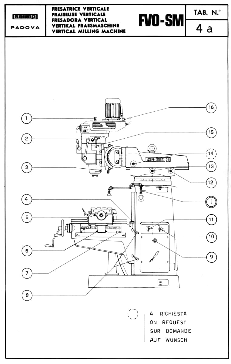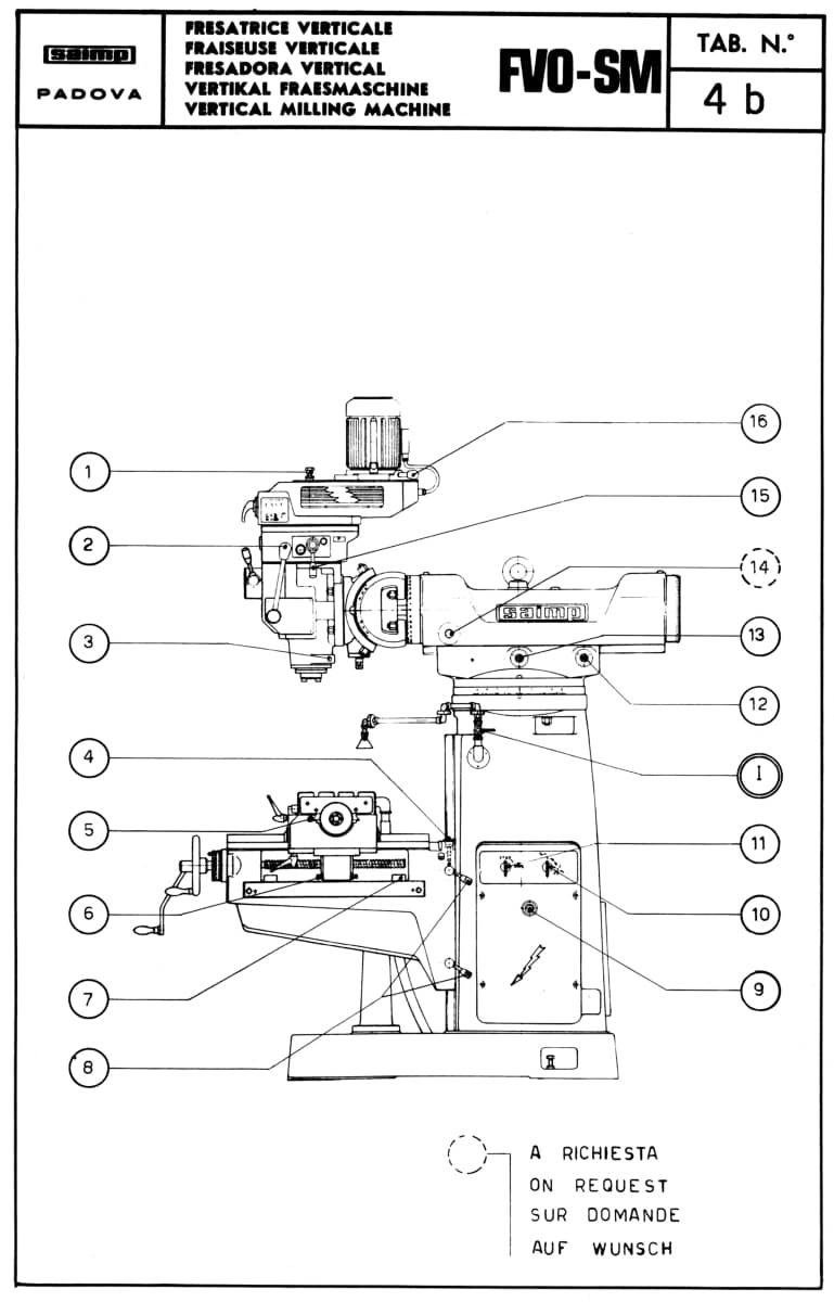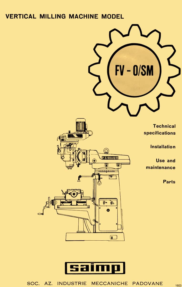 This is a reproduction, not a photocopy, of an original Saimp FV-O-SMย Vertical Milling Machine Instructions Operator’s & Parts Manual. This Saimp mill manual contains information about the milling machine specifications, installation, lubrication, and proper operating instructions. The Saimp manual contains diagrams and explanations on how to make adjustments, and includes a wiring diagrams. There is also a complete set cross-sectional view diagrams of all the parts with parts numbers for these Saimp Vertical Milling Machines.