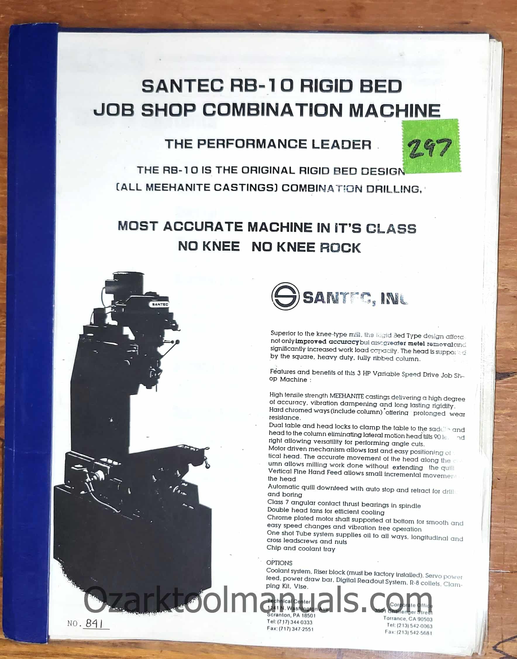 Santec RB-10 Rigid Bed Combination Milling Machine Operator Instructions Service Parts Manual