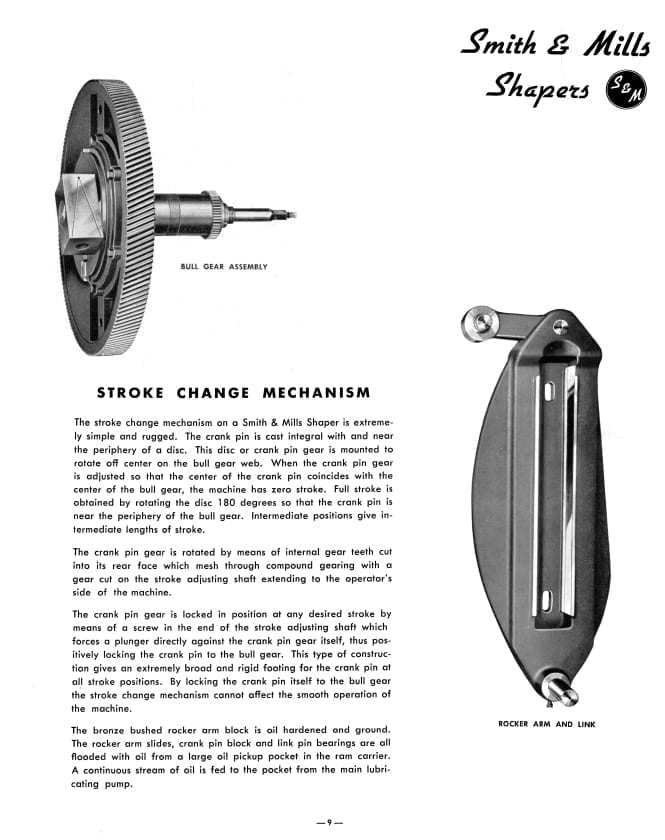 This is a reproduction, not a photocopy, of an original Smith & Mills Co. Metal Shapers Instructions, Operations, Maintenance, and Parts Manual for 12″, 16″, 20″, 25″, and 32″ metal shapers. This manual contains information about the metal shaper specifications, the initial set up, lubrication diagram with the amounts of oil each size of metal shaper takes, proper operating instructions, speed change procedures, and how to make various adjustments. This Smith & Mills manual contains cross-sectional view diagrams of the parts with parts list and descriptions.