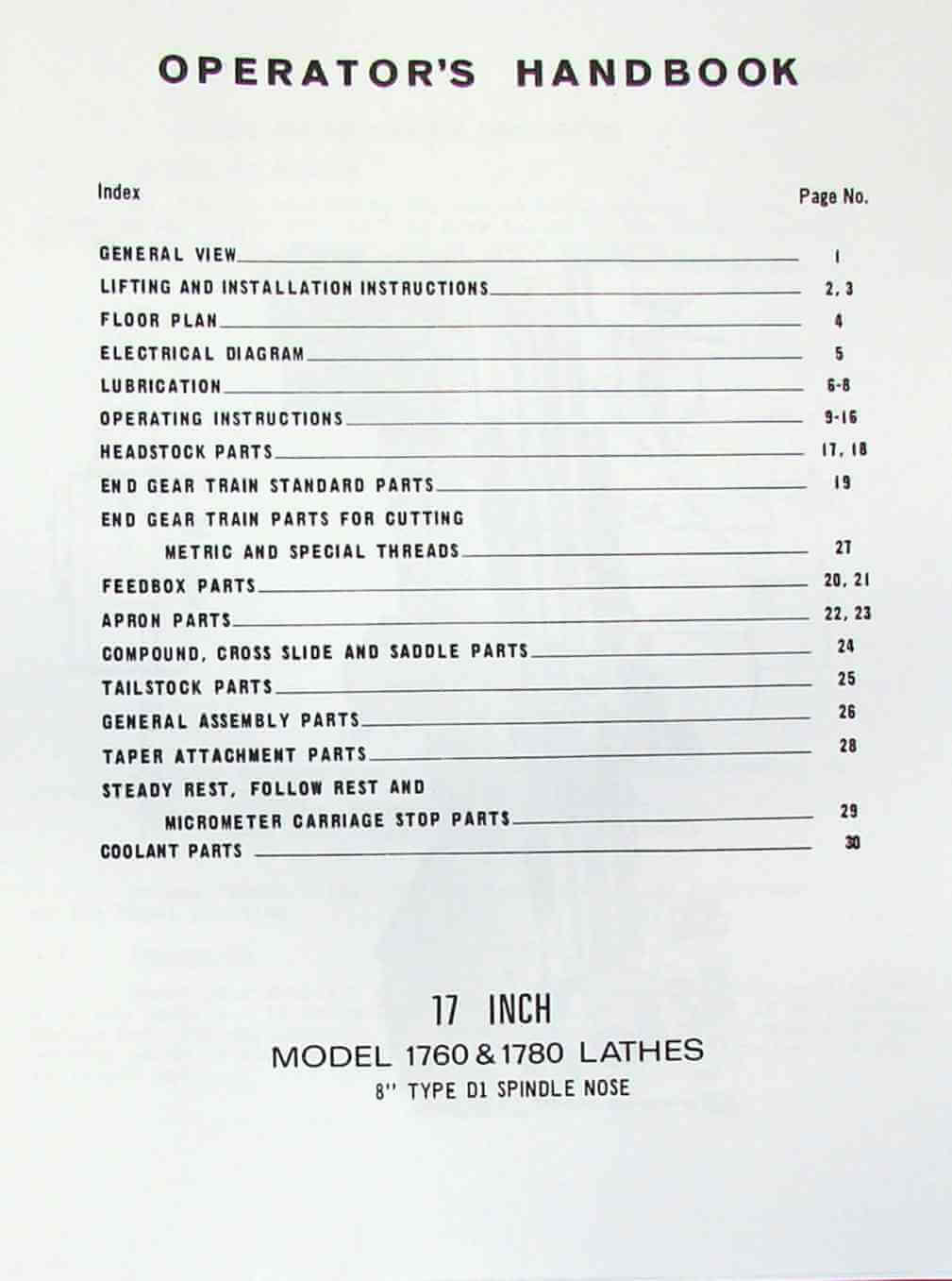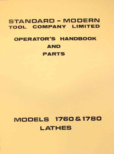 This is a reproduction, not a photocopy, of an original Standard-Modern Tool Company Model 1760 & 1780 Metal Lathe Operator’s Handbook and Parts Manual. This manual contains information on lubrication, adjustments, and pictures of the parts laid out in order of assembly. It even contains information on operating the taper attachment, which is rare for a lathe manual.