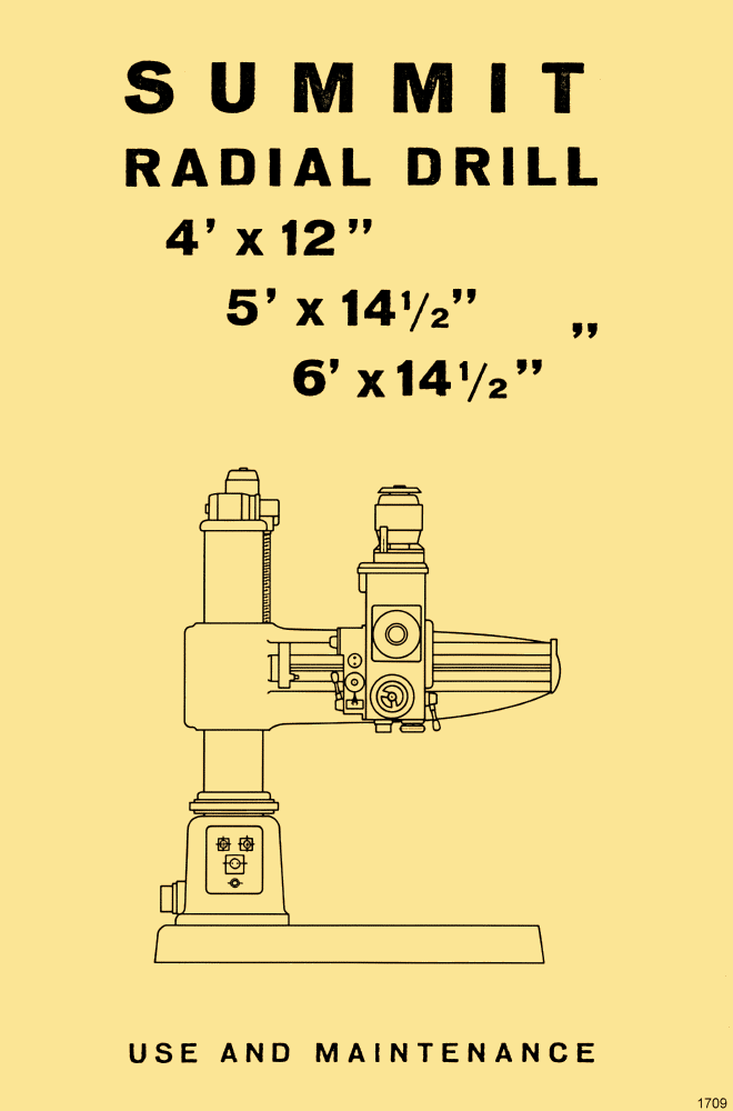 This is a reproduction, not a photocopy, of an original Summit 4 ft., 5 ft., and 6 ft. Radial Drills Operator’s and Parts Manual. This Summit Radial Drill Use and Maintenance Manual provides a complete factory guide for operating, adjusting, and maintaining Summit radial drill models in the 4′ x 12″, 5′ x 14½”, and 6′ x 14½” sizes. It begins with preliminary works and technical features, followed by instructions for lifting the machine, preparing the foundation, and understanding the driving units with accompanying drawings.