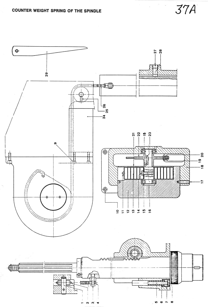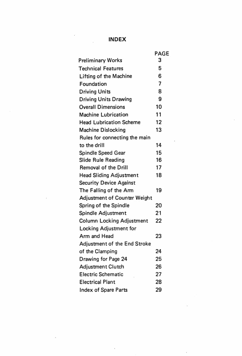The manual includes overall dimensions, full lubrication charts for both the machine and head, and procedures for unlocking and connecting the machine to power. It covers spindle‑speed gearing, slide‑rule reading, drill removal, head‑sliding adjustments, and safety devices such as the arm‑fall protection system. Additional sections explain counterweight spring adjustment, spindle and column locking adjustments, arm and head clamping, end‑stroke settings, clutch adjustment, and complete electrical schematics. The manual concludes with an index of spare parts, making it an essential reference for owners, restorers, and operators of Summit radial drills who need accurate setup, troubleshooting, and maintenance information with clear cross-sectional view diagrams of all the parts for these Summit radial drills.
