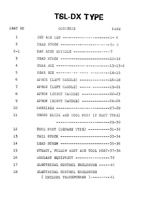 This is a reproduction, not a photocopy, of an original Takisawa TSL-DX Eight Speed Metal Lathe parts manual, and covers models TSL-550DX (14×20), TSL-800DX (14×30), and TSL-1000DX (14×40). These lathes were sold under many different names including Webb and Royal. This lathe manual includes explosive view diagrams of all the parts for these lathes including the electrical control panel.