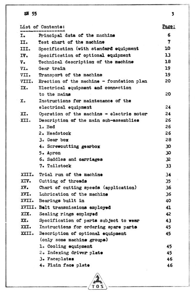 This listing is for TWO manuals. These are reproductions, not a photocopies, of original TOS SN55 Metal Lathes Operator’s Manuals and Parts Manuals. We are listing these two books together, because of the way TOS formatted them. One manual covers the operating instructions, descriptions, and lubricating instructions with just text. The other manual just contains diagrams, which the operating manual describes and refers too. So you really need both books to make sense of anything.