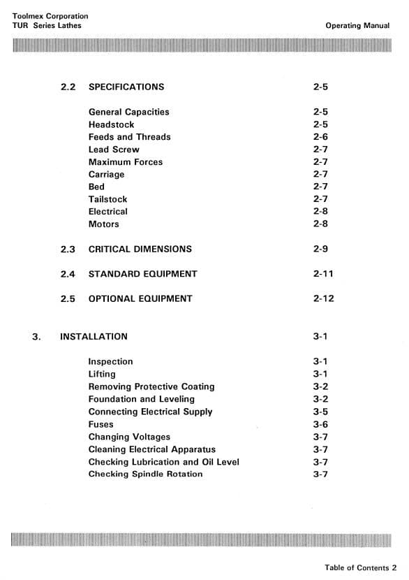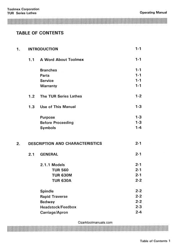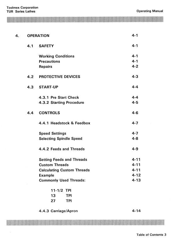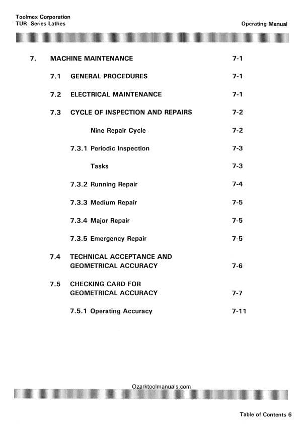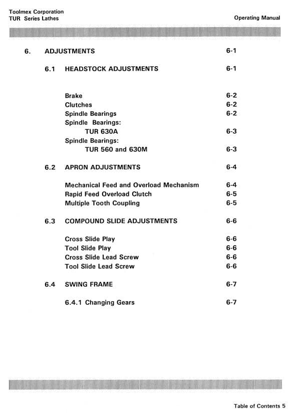 This is a reproduction, not a photocopy, of an original Toolmex TUR-560M, TUR-630M, and TUR-630A  Engine Metal Lathe Operating Instructions Manual. These metal lathes were made in Poland, and sold under many different names including Toolmex and Famot. This lathe manual contains information about the lathe specifications, installation instructions, maintenance schedules, lubricating instructions, proper operating instructions, and instructions on making various adjustments. This Toolmex manual contains instructions for adjusting the clutch, and how to make several adjustments to remove play or backlash for the TUR-560M, TUR-630M, and TUR-630A metal lathes. You can see the contents pictured above.