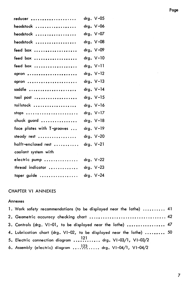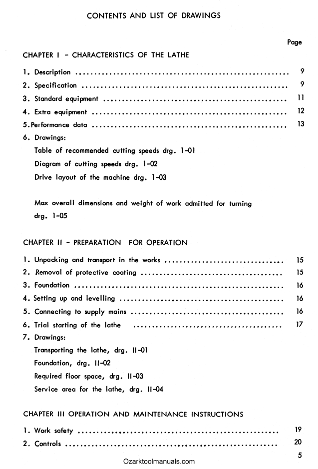 This manual contains information about the metal lathe specifications and dimensions. It also covers moving, setting up, and proper lubrication instructions. The manual covers a lot of maintenance, adjustments, and repair information. It includes instructions for adjusting the spindle bearings, main drive clutch, brake, and more. The manual also contains the thread chart for standard and metric threads.