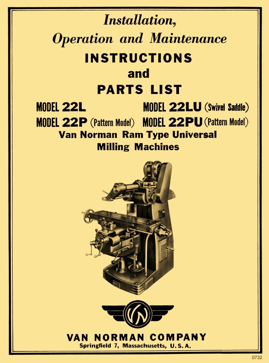This is a reproduction, not a photocopy, of a Van Norman Models 22L, 22LU, 22P & 22PU Ram Type Universal Milling Machine Instructions and Parts Manual. This manual provides detailed specifications for the milling machine, along with proper lifting and installation instructions. It explains the operation of the machine’s various components and includes lubrication and maintenance guidelines to ensure reliable performance. A complete set of clear exploded‑view diagrams for all Van Norman mill parts is also included.