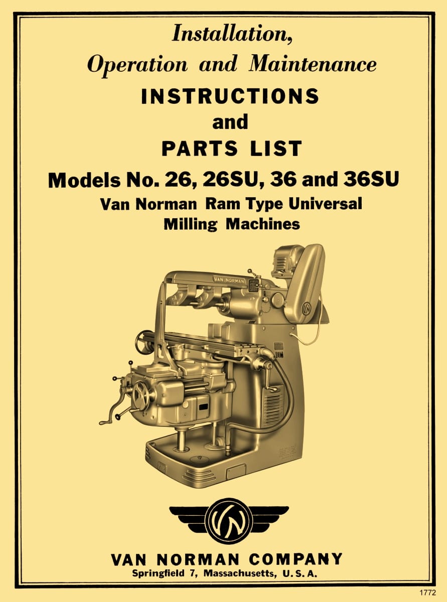 This is a reproduction, not a photocopy, of a Van Norman Models 26, 26SU, 36, and 36SU Ram Type Plan and Universal Milling Machines Instructions, Maintenance, and Parts Manual. This manual provides detailed specifications for the milling machine, along with proper lifting and installation instructions. It explains the operation of the machine’s various components and includes lubrication and maintenance guidelines to ensure reliable performance. A complete set of clear cross-sectional‑view diagrams for all Van Norman mill parts is also included.