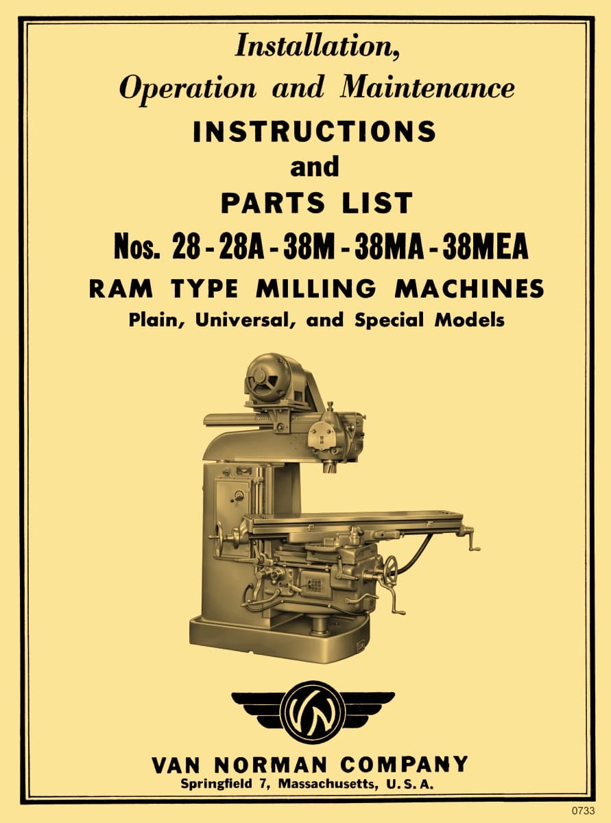 This is a reproduction, not a photocopy, of an original Van Norman Ram Type Milling Machines Operations and Parts Manual. This manual covers the Plain Universal and Special Models, including Nos. 28, 28A, 38M, 38MA, and 38MEA. This manual provides detailed specifications for the milling machine, along with proper lifting and installation instructions. It explains the operation of the machine’s various components and includes lubrication and maintenance guidelines to ensure reliable performance. A complete set of clear exploded‑view diagrams for all Van Norman mill parts is also included.