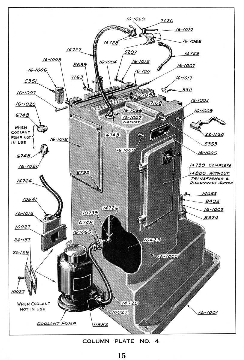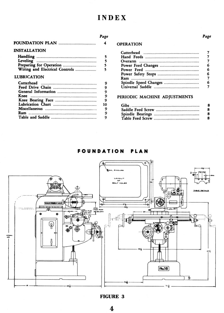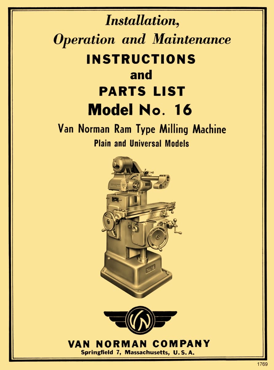 This is a reproduction, not a photocopy, of a Van Norman No. 16 Ram Type Plan and Universal Milling Machines Instructions, Maintenance, and Parts Manual. This manual provides detailed specifications for the milling machine, along with proper lifting and installation instructions. It explains the operation of the machine’s various components and includes lubrication and maintenance guidelines to ensure reliable performance. A complete set of clear cross-sectional‑view diagrams for all Van Norman mill parts is also included.