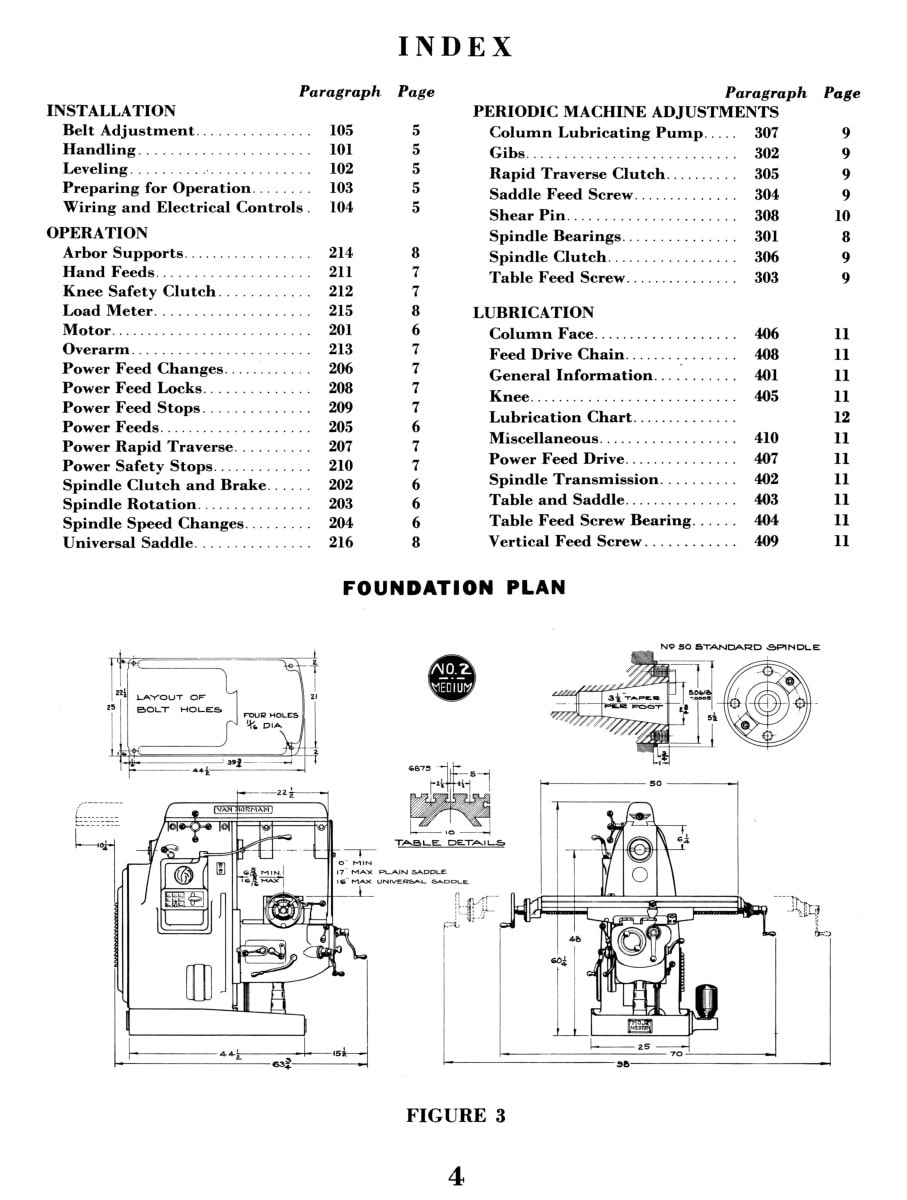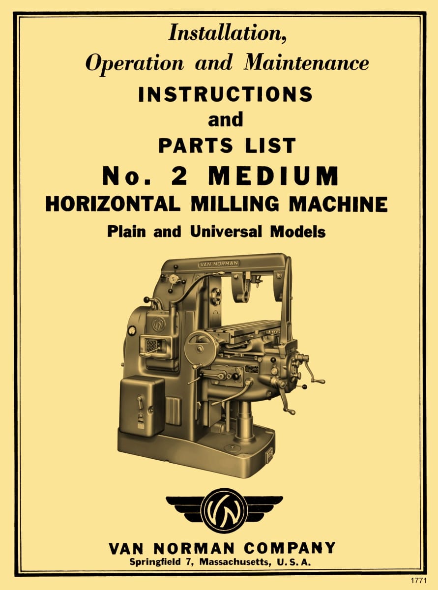 This is a reproduction, not a photocopy, of a Van Norman Models No. 2 Medium Horizontal Plan and Universal Milling Machines Instructions, Maintenance, and Parts Manual. This manual provides detailed specifications for the milling machine, along with proper lifting and installation instructions. It explains the operation of the machine’s various components and includes lubrication and maintenance guidelines to ensure reliable performance. A complete set of clear cross-sectional‑view diagrams for all Van Norman mill parts is also included.
