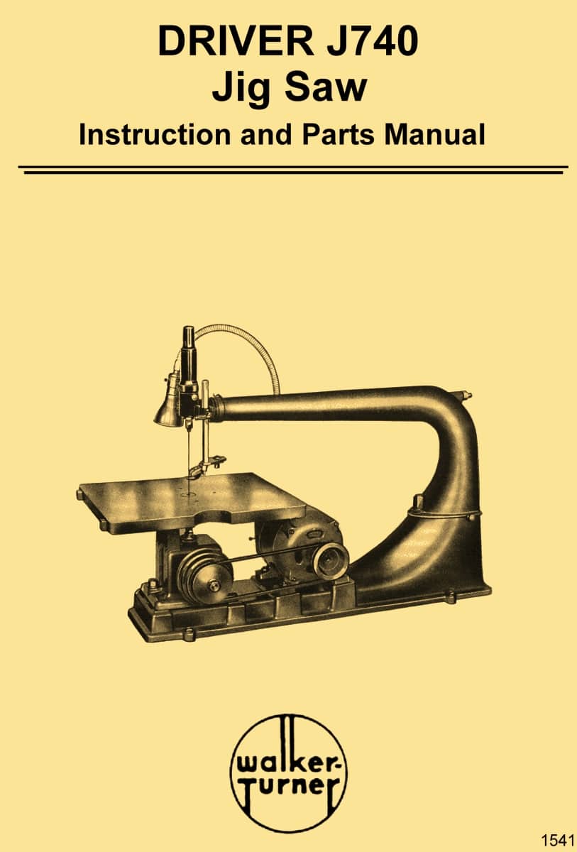 This is a reproduction, not a photocopy, of an original Walker Turner J740 24″ Driver Jig Saw Instructions and Parts Manual. This manual contains one page on operating instructions and lubrication, and pages with cross sectional view parts diagrams with descriptions. I’ve also included a page from catalog that has information about specifications and accessories.