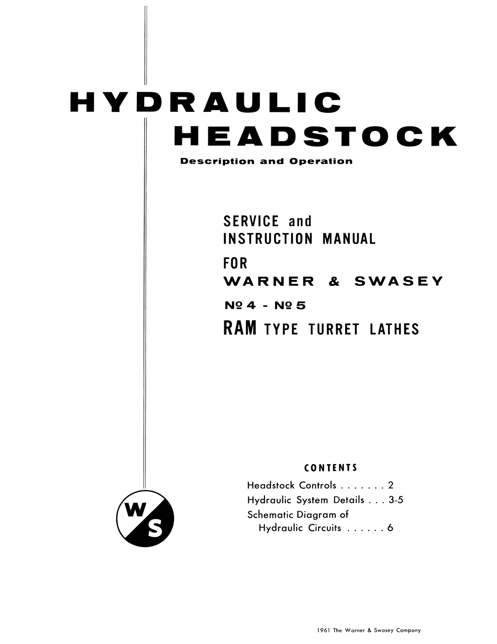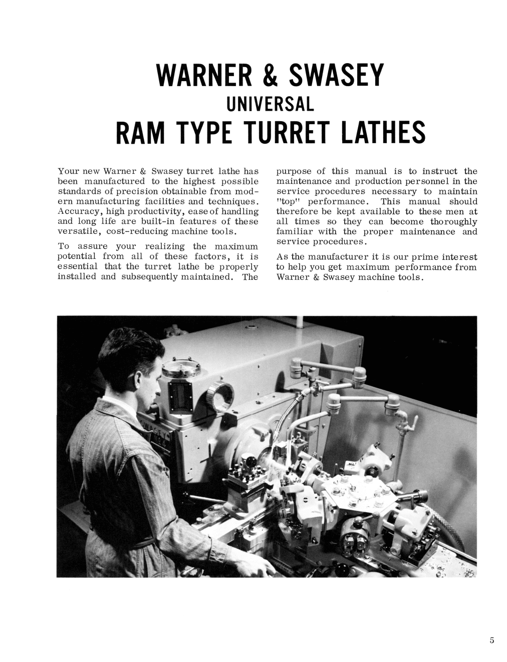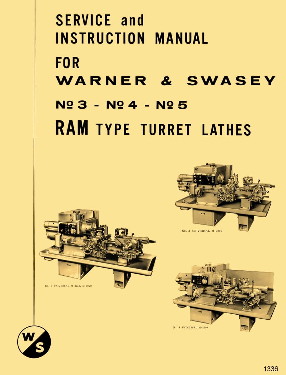 This is a reproduction, not a photocopy, of an original Warner Swasey No. 3, No. 4, No. 5, Geared Head Ram Type Turret Lathe Service and Instructions Manual. This manual covers the newer models which include M-2200, M2240, M-2250, and M-2770.