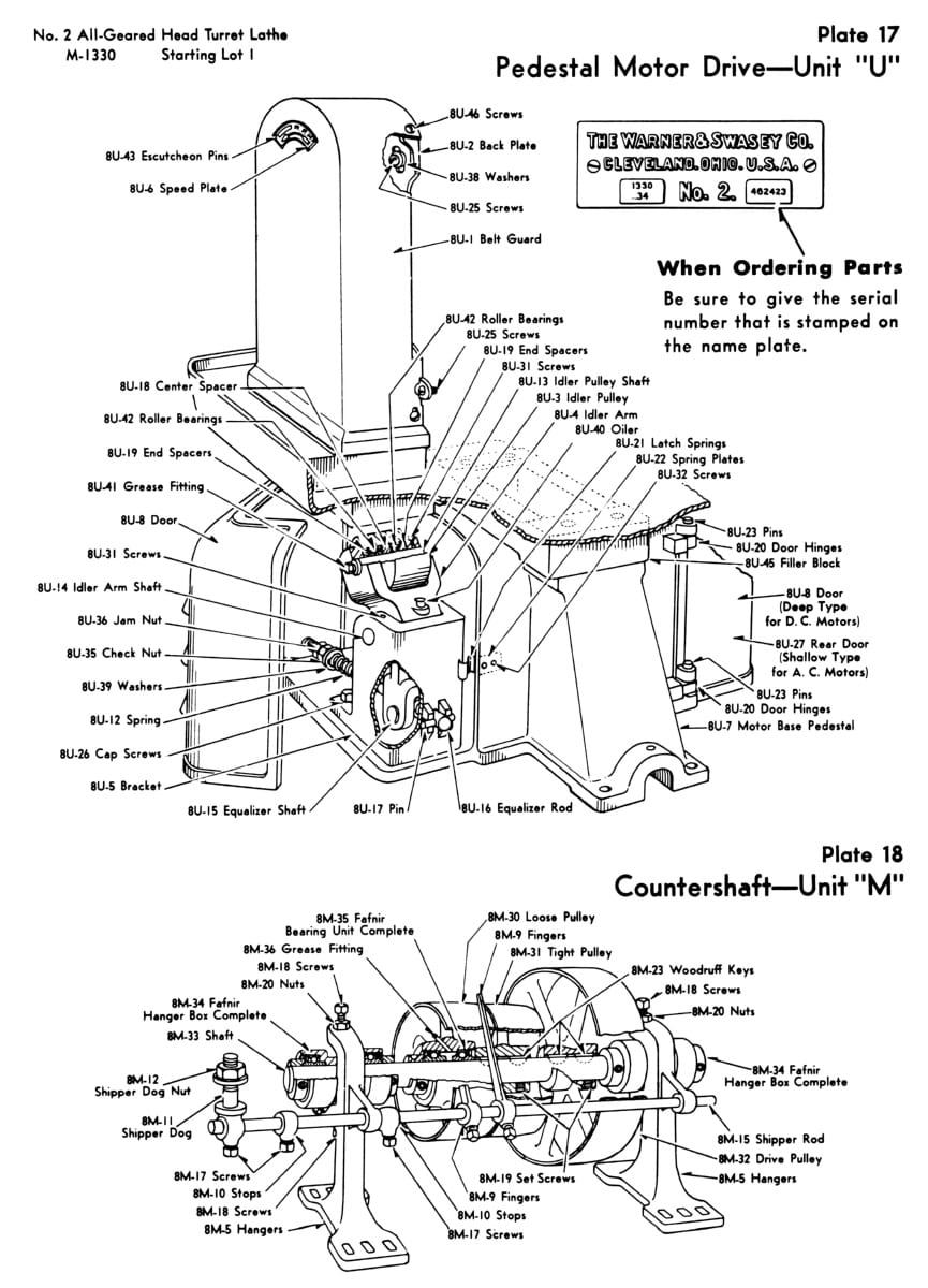 This is a reproduction, not a photocopy, of an original Warner Swasey No. 2 Geared Head Ram Type Turret Lathe Model M-1330 Operator’s Instructions, Service, and Parts Manual. This came from a master service manual, and has the parts combined from multiple vintages of the No. 2 turret lathes. This manual covers Lot #1 and up for the M-1330 lathes.