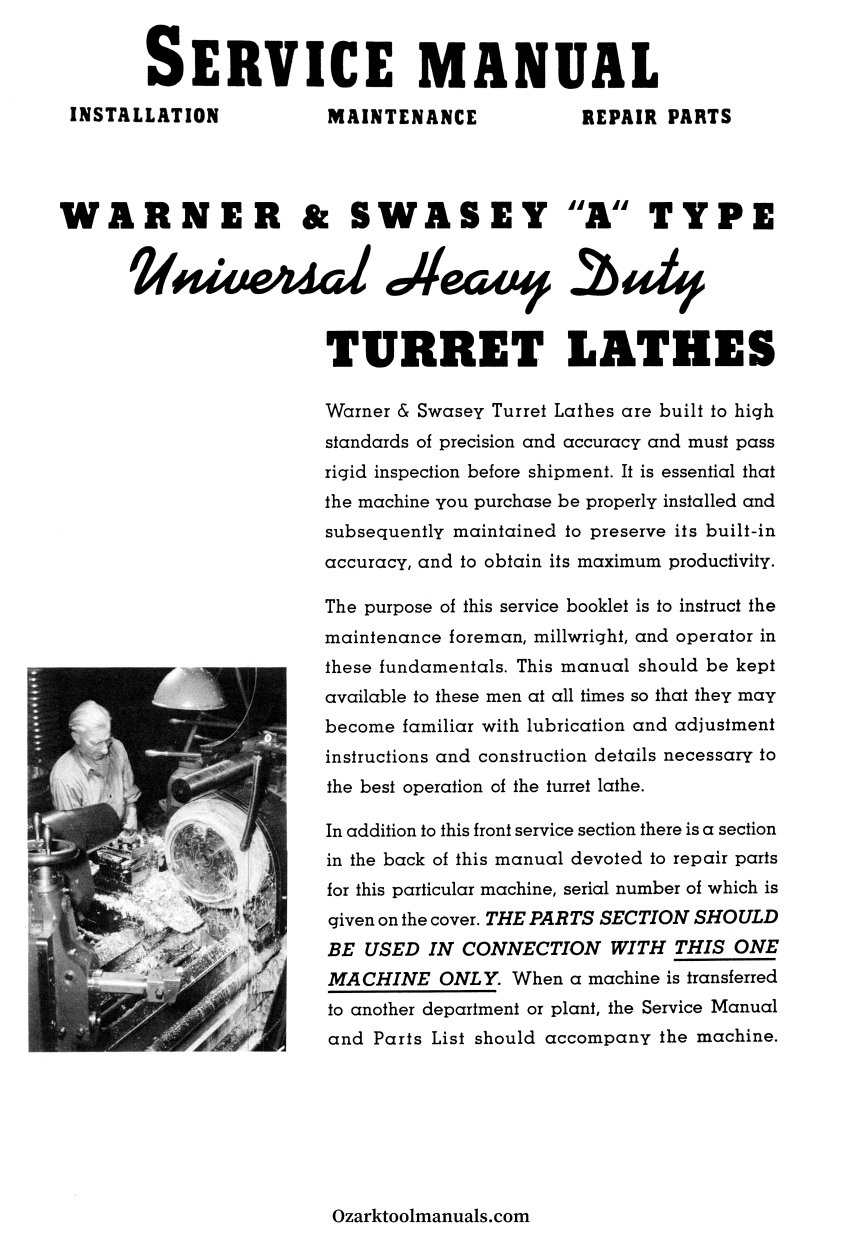 This is a reproduction, not a photocopy, of an original Warner Swasey No. 1A, No. 2A, No. 3A, No. 4A, Universal Heavy Duty Turret Lathes Service and Instructions Manual. The manual for the turret lathes covers information about loading and installing the lathe, proper lubricating instructions, and how to align the different parts of the lathe correctly. It also covers how to adjust the clutches, and how to remove the brake lining, pulley shaft, idler shaft, and gear shaft. The manual contains information about adjusting the turret slide and saddle, plus the indexing mechanism.
