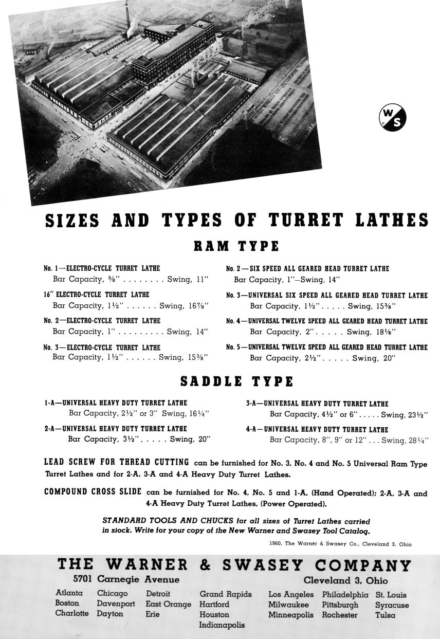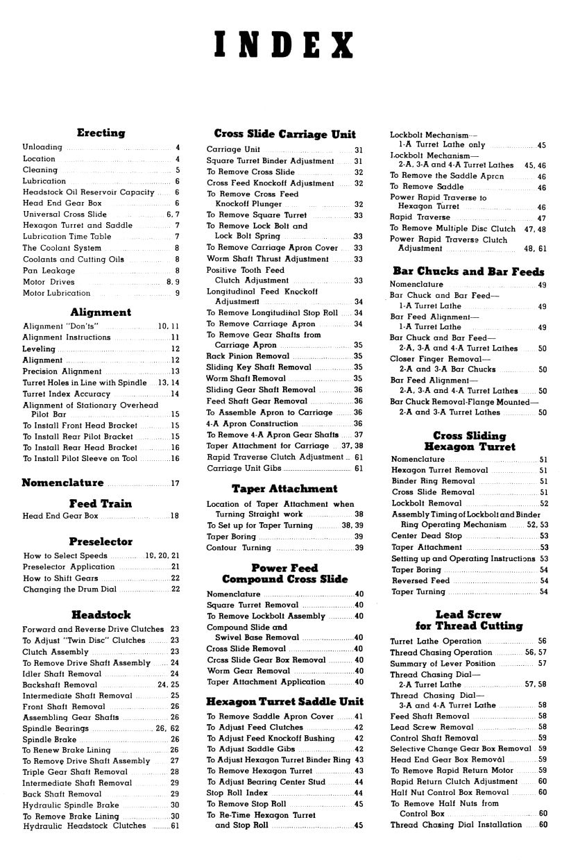 The manual covers the feed train, and the collet and bar feed systems as well. The back has the feeds and speed charts as well as a complete set up explosive/cross sectional view diagrams of all the parts with descriptions. Please read the contents pictured above for more details. This is the best manual you can buy for the older Warner Swasey No. 1A, No. 2A, No. 3A, No. 4A, Universal Heavy Duty Turret Lathes.