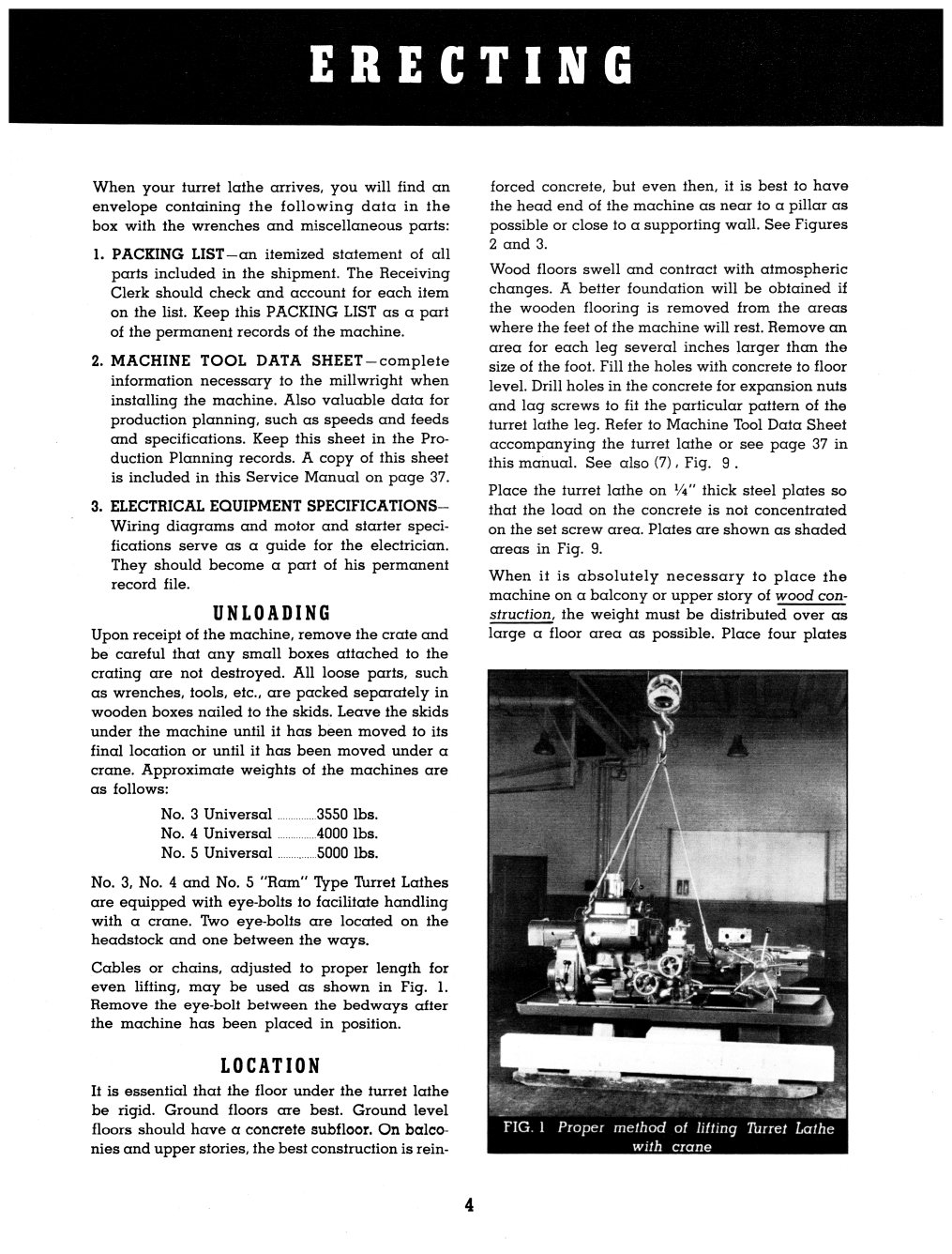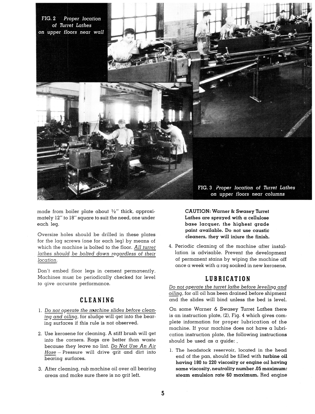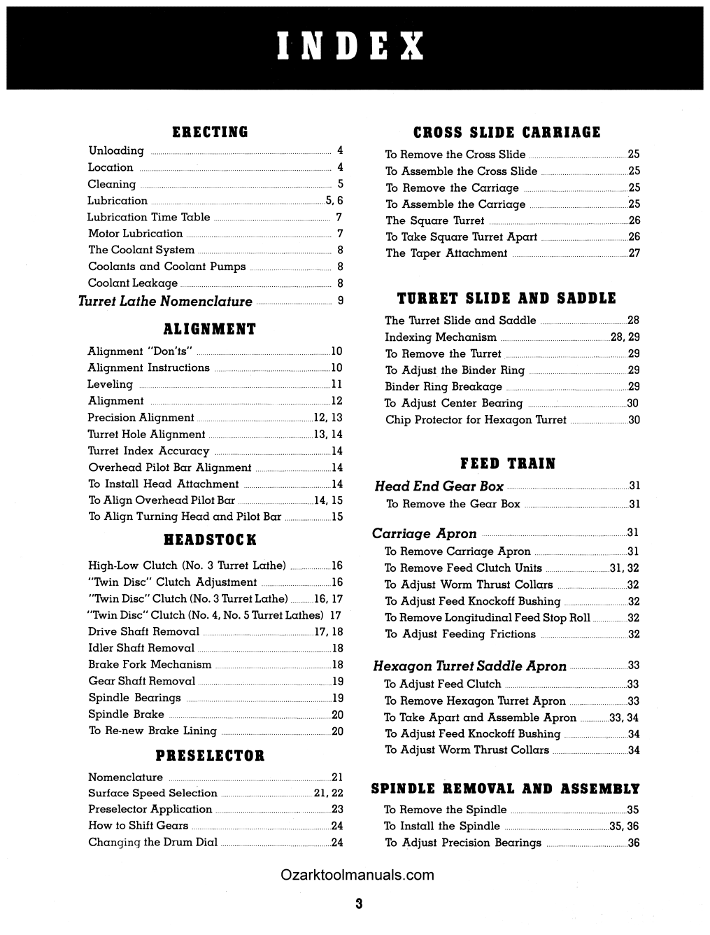 The manual for the Warner Swasey No. 3, No. 4, No. 5 Universal turret lathes covers information about loading and installing the lathe, proper lubricating instructions, and how to align the different parts of the lathe correctly. It also covers how to adjust the clutches, and how to remove the brake lining, pulley shaft, idler shaft, and gear shaft. The manual contains information about adjusting the turret slide and saddle, plus the indexing mechanism.