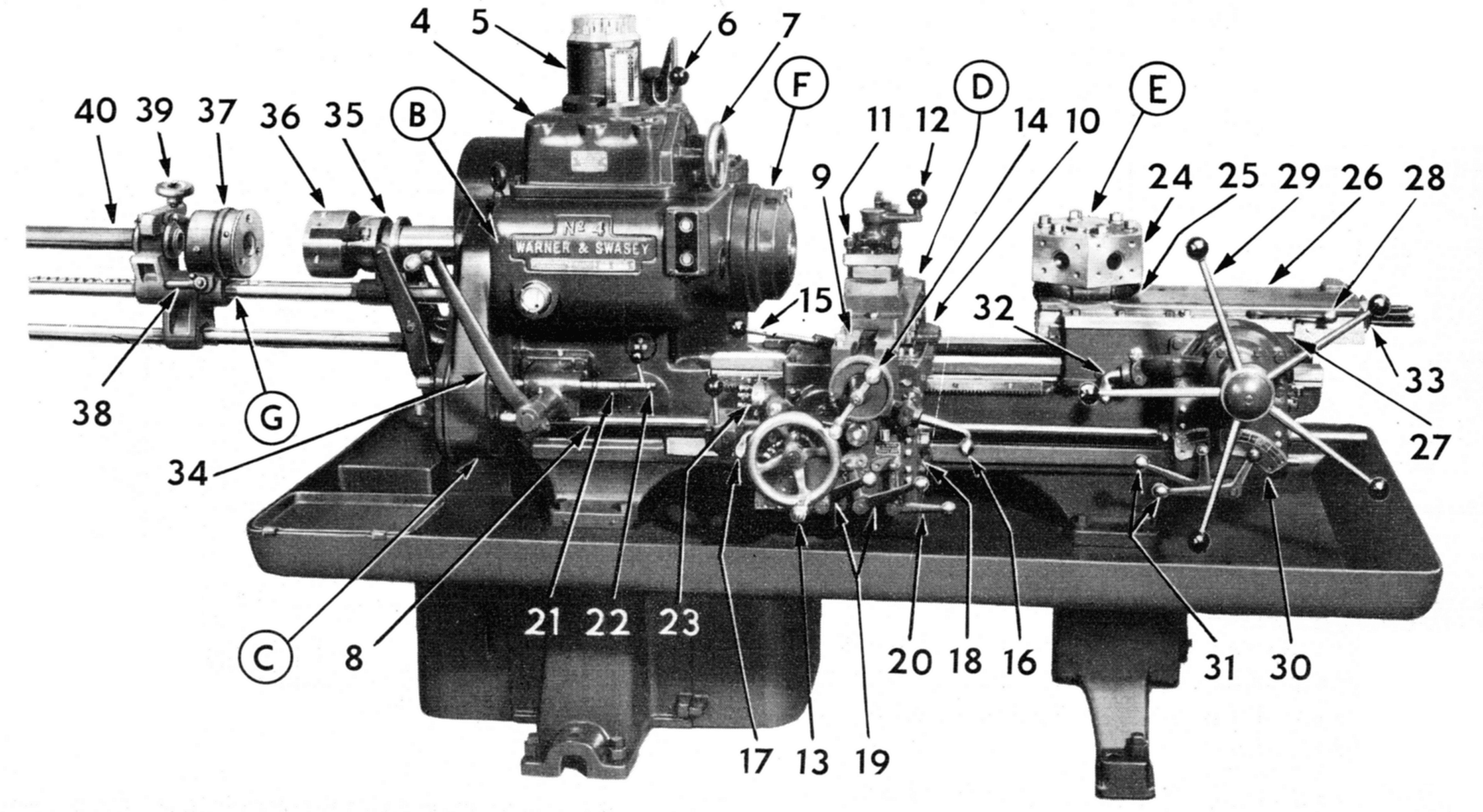 The manual covers the feed train, and the collet and bar feed systems as well. The back has the feeds and speed charts as well as a complete set up explosive/cross sectional view diagrams of all the parts with descriptions. Please read the contents pictured above for more details. This is the best manual you can buy for the older Warner Swasey No. 3, No. 4, No. 5 Universal Turret Lathes.