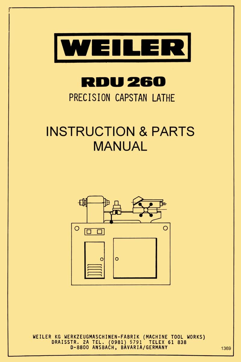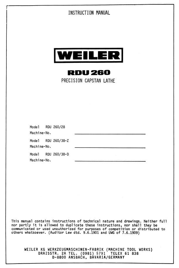 This is a reproduction, not a photocopy, of a Weiler Model RDU-260 Precision Capstan Metal Lathes Operating Instructions and Parts Manual. This covers the following models RDU-260/28, RDU-260/38-Z, and RDU-38-D.