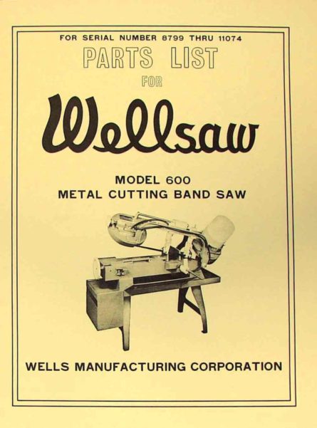 This is a reproduction, not a photocopy, of an original Wellsaw Model No. 600 Metal Cutting Band Saw Operations and Parts Manual. This manual contains a blade selection chart, trouble shooting guide, and a complete set of exploded view parts diagrams of all the parts.