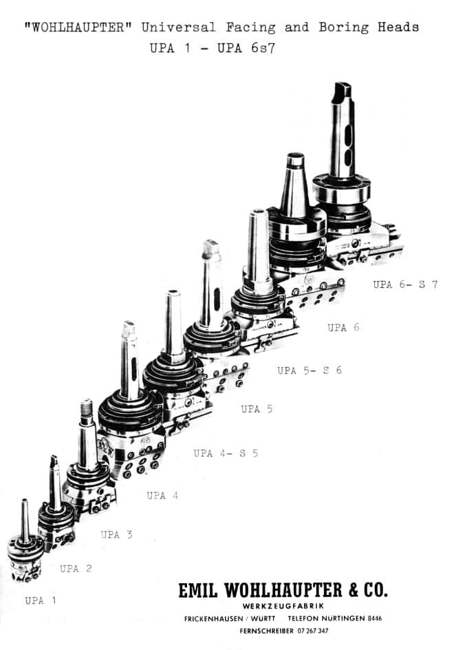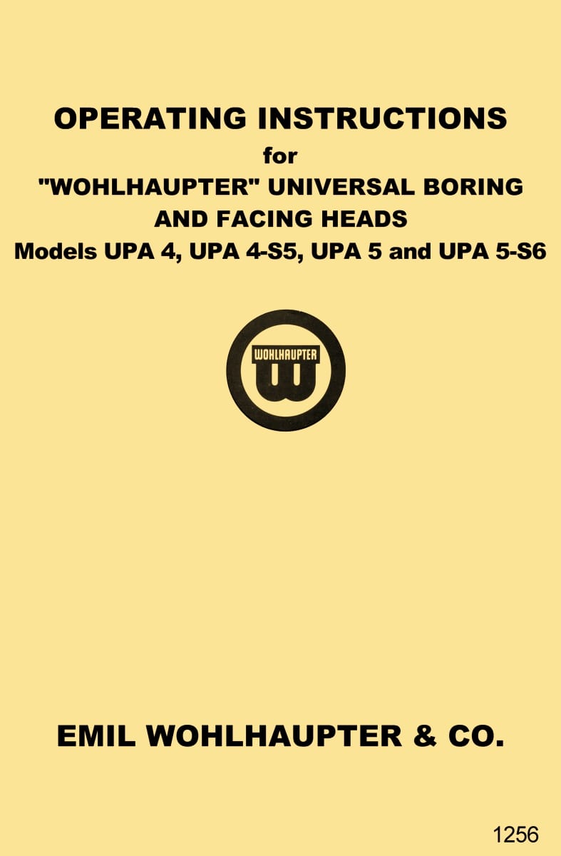 This is a reproduction, not a photocopy, of an original Wohlhaupter Universal Boring and Facing Heads Models UPA 4, UPA 4-S5, UPA 5, and UPA 5-S6 Operating Instructions Manual. This manual explains how to turn inside and outside diameters, perform facing, recessing, and undercutting as well as taper turning. We’ve also included a sales bulletin that covers all the different masterheads Wohlhaupter made with their specifications.