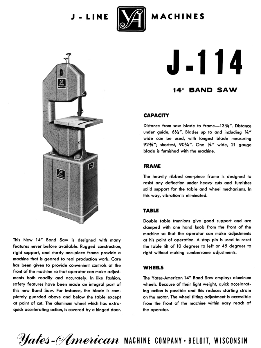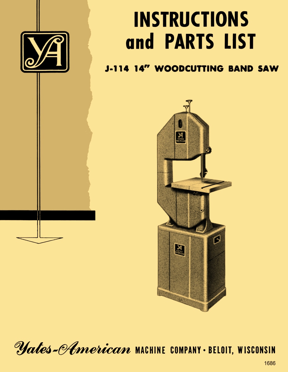 This is a reproduction, not a photocopy, of an original Yates-American J-114 14-inch Wood Band Saw Operator’s and Parts Manual. This manual contains information on this band saw’s specifications, proper operating instructions, maintenance, and adjustments. There are also wiring diagrams, and a complete set of clear explosive view diagrams of all the parts with a parts list and descriptions for this Yates-American band saw.