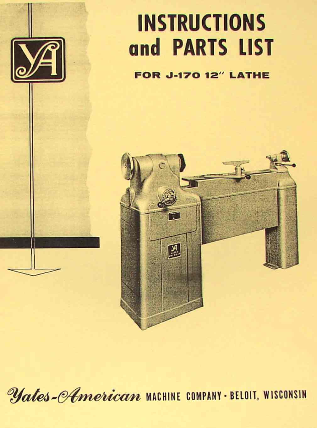 This is a reproduction, not a photocopy, of an original Yates-American J-170 12″ Variable Speed Wood Lathe Instructions and Parts Manual. Brodhead-Garrett bought the rights in the 1960s to sell this lathe for vocational purposes, but Yates-American still manufactured the lathe. This manual contains information on electrical wiring diagrams, maintenance, adjustments, operations, and controls. It also contains exploded view diagrams of all the parts for the lathe.